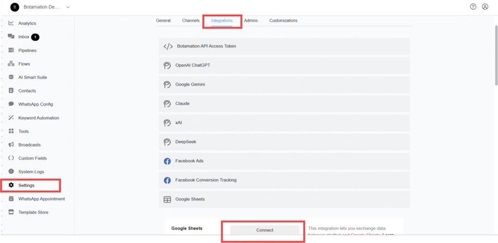 To Connect Google Sheets Go To Settings >> Integrations >> Google Sheets