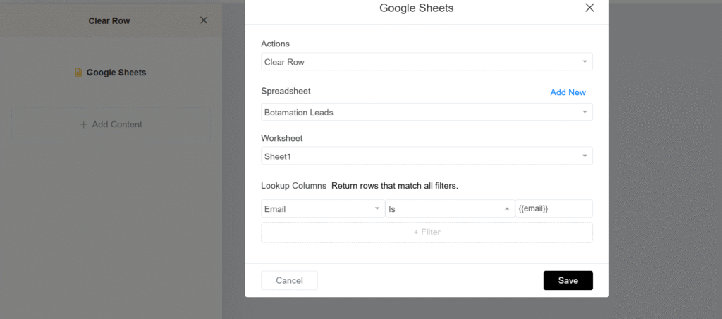 To Clear Data in Google sheets pass google sheet column value in the filter on which row need to be deleted.